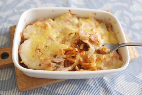 スパゲッティをアレンジしてグラタンを作りました。とろ〜り熱々のグラタンは、大満足のボリュームで、ランチにもぴったりです。