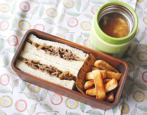 ご飯に合うならパンにも合うはず!というわけで、牛ごぼうの甘辛炒めをサンドイッチの具にしてみました。この組み合わせ、意外といけます。
