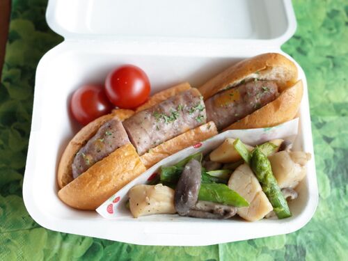 低糖質の「大豆コッペパン」でホットドッグを作ってお弁当にしました。お弁当箱の形に合わせて詰め方を一工夫。