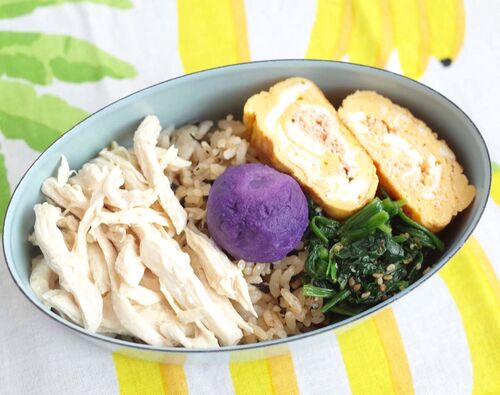 福岡土産の明太子をいただいたので、卵焼きにたっぷり加えて一品作りました。 鶏ムネ肉の柚子胡椒マヨ和え、明太子入り卵焼き、ほうれん草のナムル、ひじきごはん、紫ジャガボール