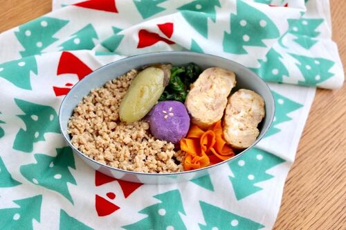 倉敷意匠のほうろう弁当箱は深さもあって、のっけ弁にぴったりです。この日はそぼろがメイン。