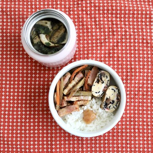 おかず2品、ふたしな弁当。この日は即席わかめスープを付けて持っていきました。