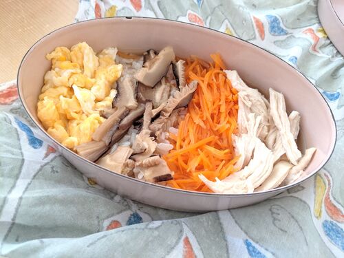 スープジャーを使ったお弁当。今回は鹿児島名物の鶏飯を持っていきました。ご飯の上にスープをかけていただきます。