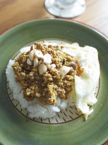 スパイスカレーに興味がありつつ、まだ必要最低限のスパイスを買い揃えられていないので、今回は市販の「カレー粉」を使って、自己流キーマカレーを作りました。 キーマカレー作り ラム肉はフードプロセッサーを使って、ミンチにしました。