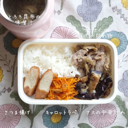 作り置きおかずを詰めた地味弁当と、お味噌汁のお弁当です。味噌汁は、顆粒みそを使って、鍋を使わずに作りました。