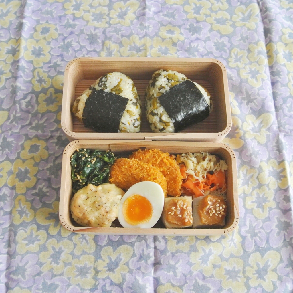 九州の実家から送られてきた高菜を使って、高菜おにぎり弁当。