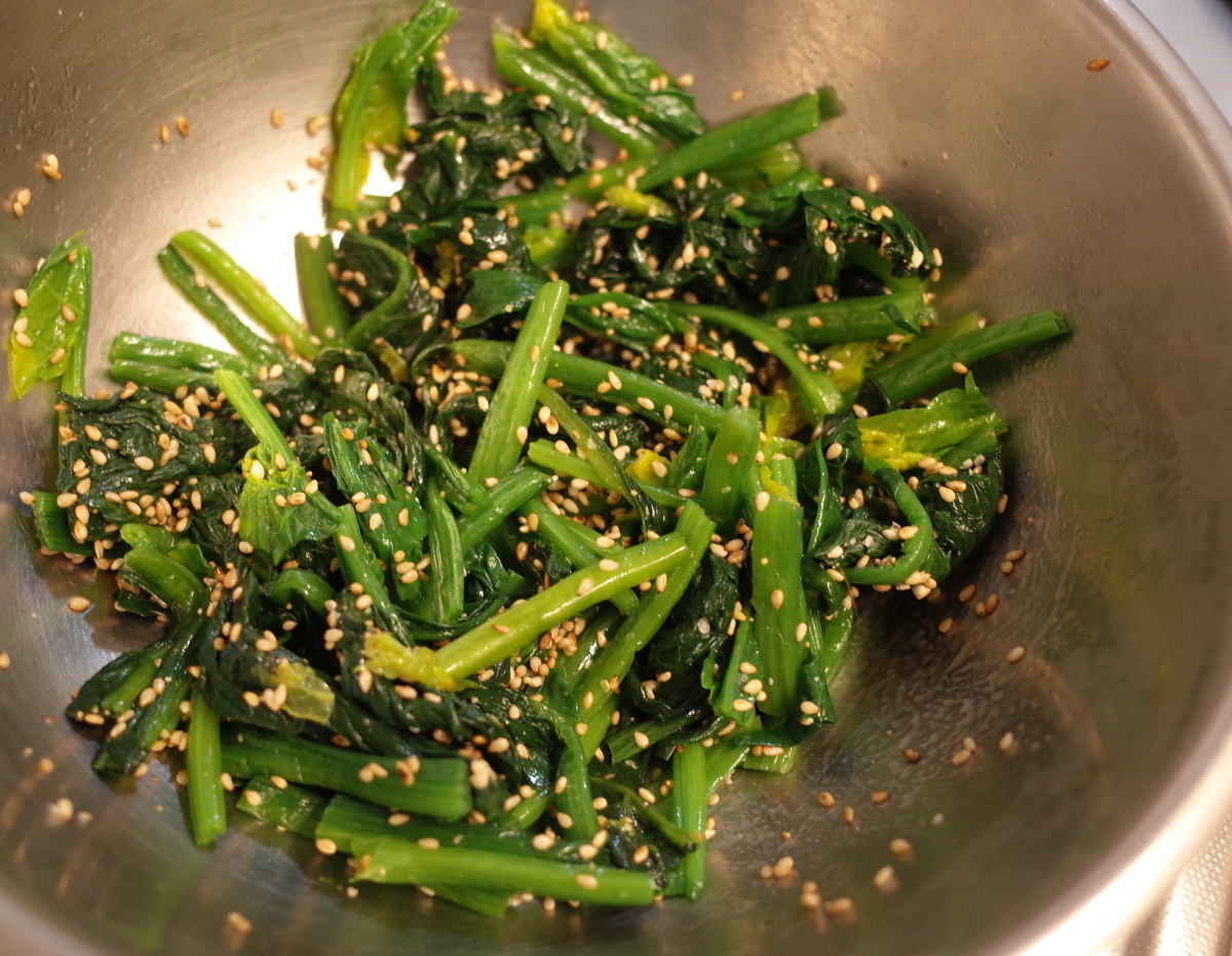 メインが甘めの味付けになるなら、ほうれん草は味の方向性をずらしたいところ。ごま油と鶏がらスープを使ってナムルを作ることにしました。