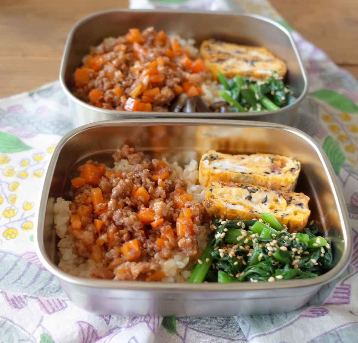 メインのそぼろを手際よく盛り付けるために、もう1セットもほぼ同じ手順で盛り付けて、あとはそぼろを乗せるだけの状態を作ります。