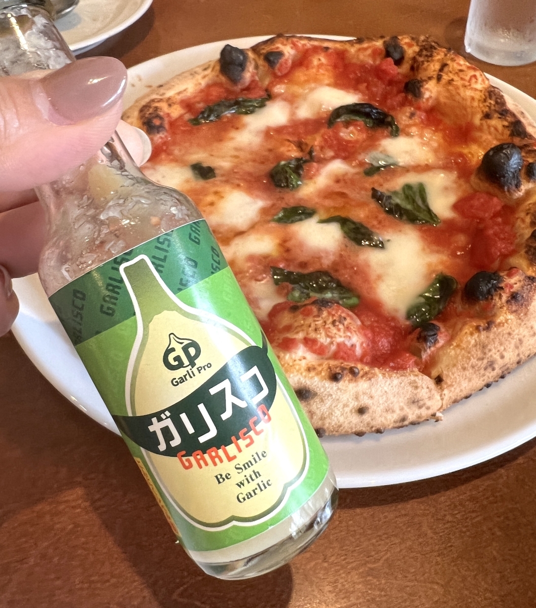 テーブルの上には、初めての調味料「ガリスコ」がありました。ピザにトッピングすると、にんにくのフレーバーが加わって、美味しさ増し増しに。