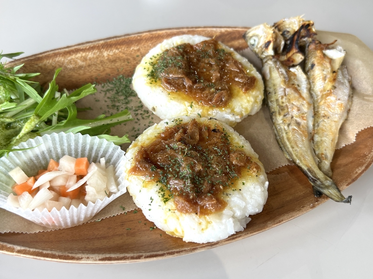 ランチに食べたのは、へしこの焼きおにぎり。おにぎり好きとしては、食べたことのないおにぎりを見つけたら、食べずにはいられません。