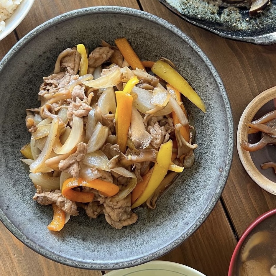 豚肉を米油で炒めて塩を少々、そこに玉ねぎ(レンチンで加熱済み)とパプリカを加え、鶏がらスープの素、醤油、オイスターソース、香酢、砂糖を加えて味を調えました。