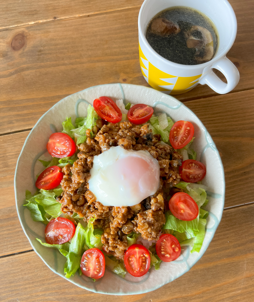 ワンプレートで済むので、オンラインランチの時など、仕事用の狭いデスクで食べる時にちょうどいいです。